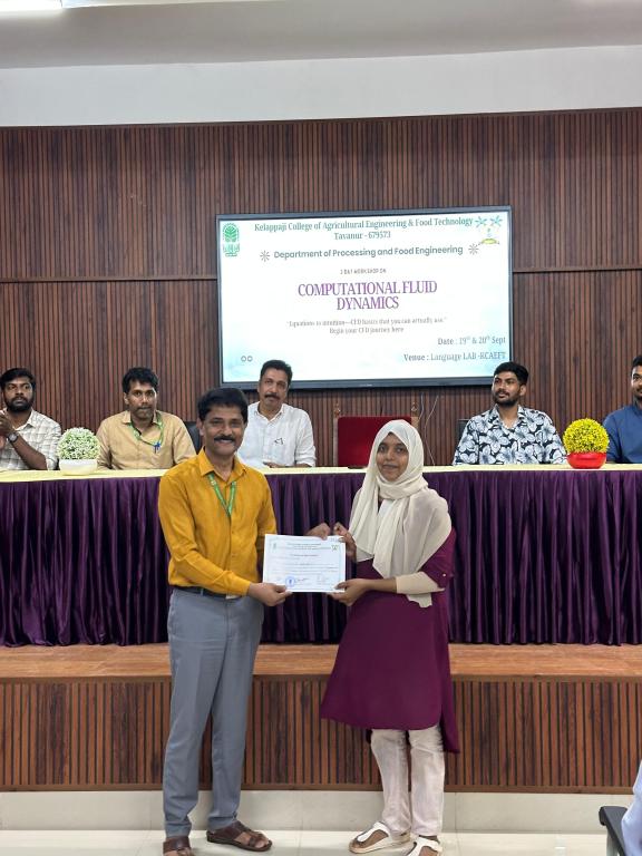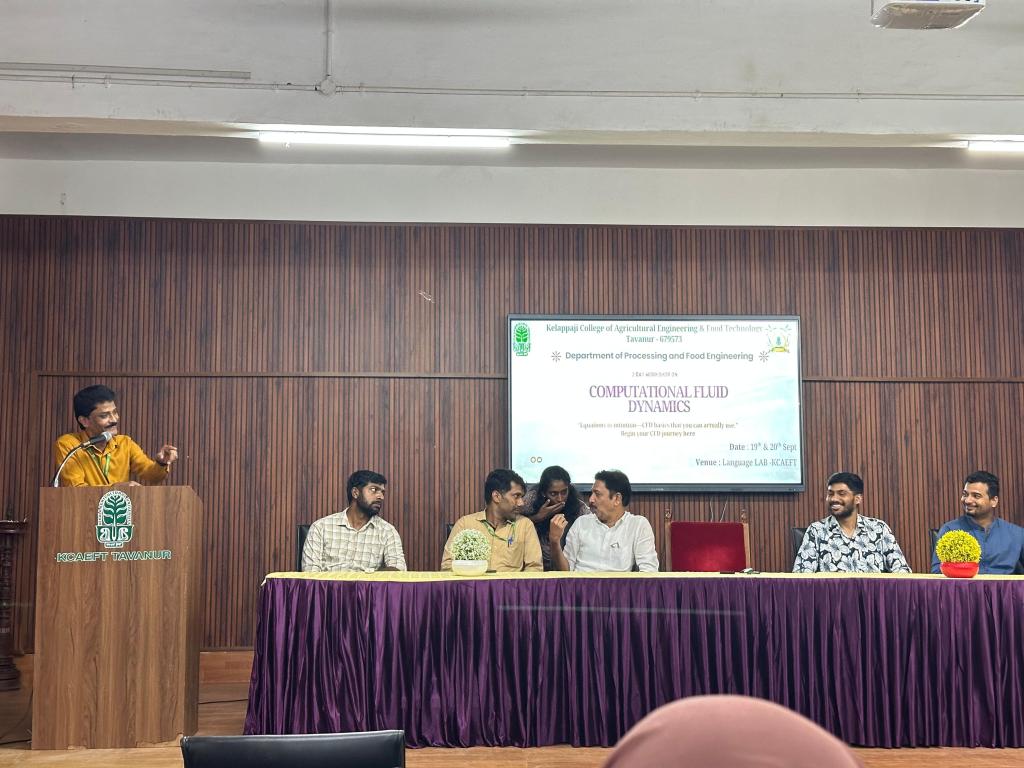 A two-day workshop on Computational Fluid Dynamics (CFD) was successfully conducted on 19–20 September 2025 by the Department of Processing and Food Engineering, KCAEFT, Tavanur. Led by PMRF Scholars Er. Ritu Raj Kumar and Mr. Sumit Shankar from IIT Madras, the programme featured technical sessions and hands-on training with CFD tools. Over 30 participants, including students and faculty, gained practical skills in simulation, analysis, and applications.